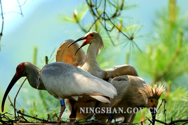 朱鹮出生两年后,开始谈恋爱,找到相爱的伴侣后,就开始寻找一个合适的地方安家,朱鹮只有在繁殖时才筑巢,巢一般都建在高大的松树、杨树上,从此后它们日夜厮守在一起,寻食、飞翔,彼此为对方梳理羽毛,亲亲热热,频频交配,产卵,雌鸟通常产2—4枚卵,雌雄鸟共同孵卵, 28天后孵化出小朱鹮,60天后离巢跟随父母自由飞翔。朱鹮是典型的一夫一妻的鸟类。一对朱鹮配成对后终生厮守在一起,双飞双宿,形影不离,共同承担抚育下一代的重任。