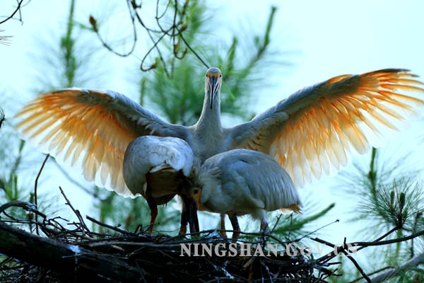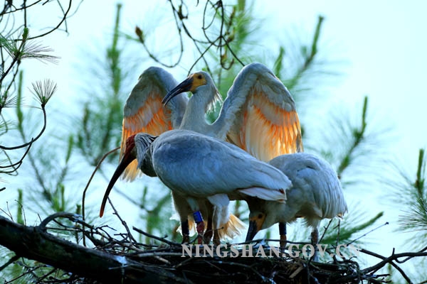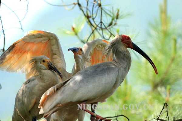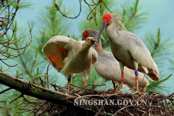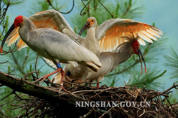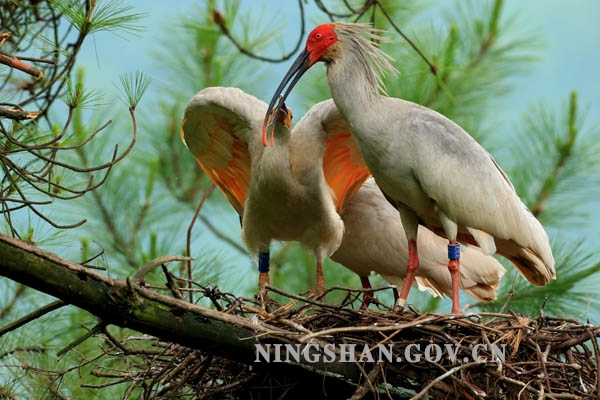 这组图片详细记录了宁陕野化放飞朱鹮雏鸟展翅离巢前短暂难得的精彩瞬间。小朱鹮一天天长大,羽毛丰满,在父母的精心守护和教导下,时不时地练习扇动翅膀,活动频率加大,活动范围扩大,有时候走到巢边的树枝上,增加胆量,父母不厌其烦地一次又一次为小鸟示范离巢初飞的动作,引导小朱鹮展翅离巢,第一次就要从这么高的巢树上飞下去,这对小朱鹮来说,这一刻确实是他一生中最艰难也是最勇敢的选择。